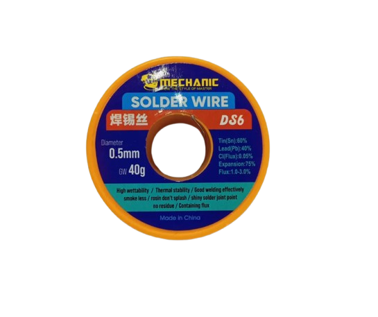 Alambre de soldadura para electrónica con aleación 60/40 (Sn/Pb), diámetro 0,5 mm y flux interno.